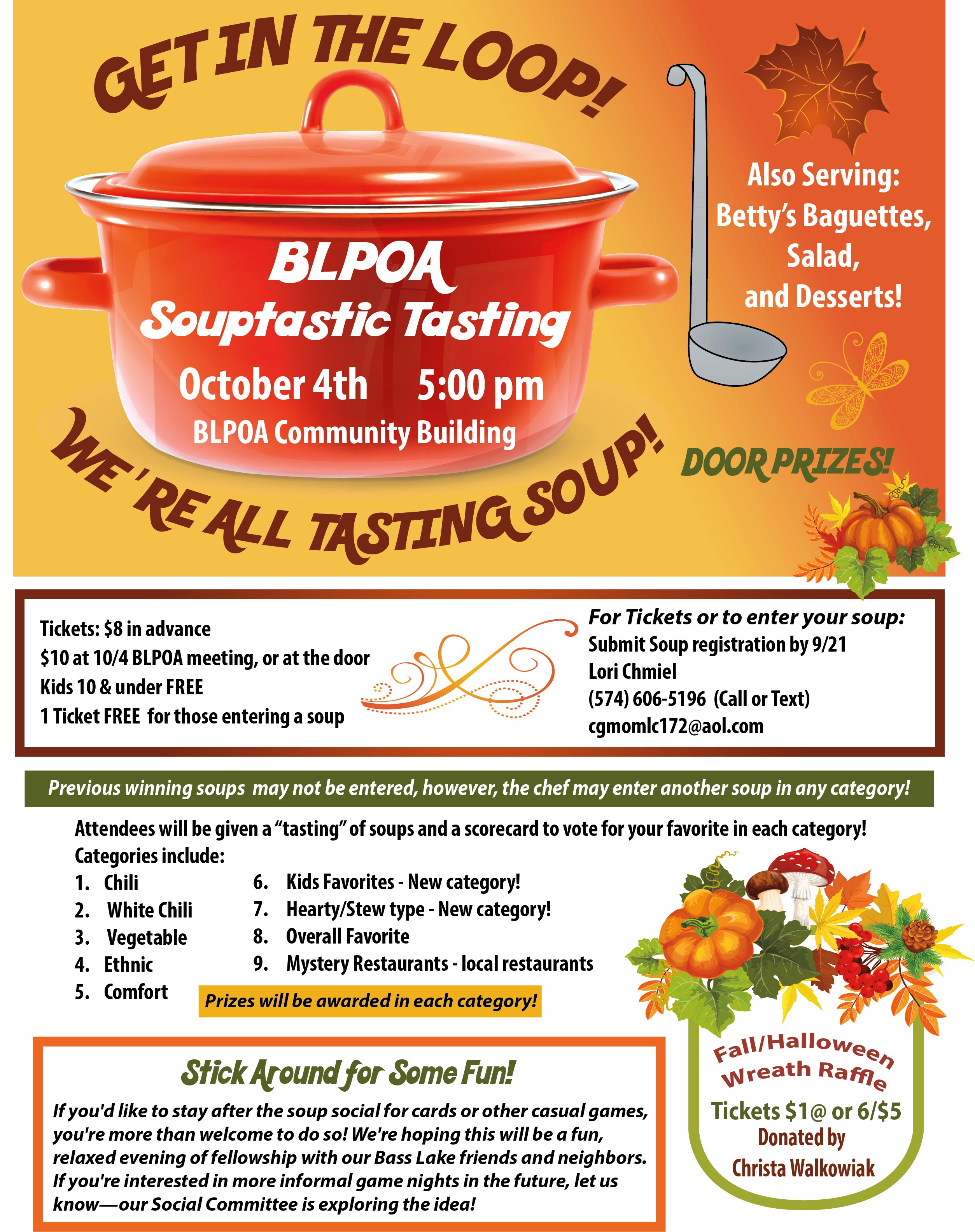 Come join us for our Annual Soup Social on Saturday, October 4 (doors open at 5:00 PM). Tickets are $8 in advance and $10 day of event; kids 10 and under are free. To purchase tickets or register a soup please contact Lori Chmiel at (574) 606-5196 or cgmomic172@aol.com. FLYER
